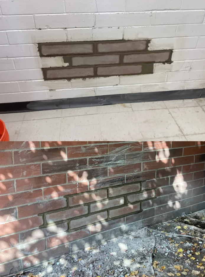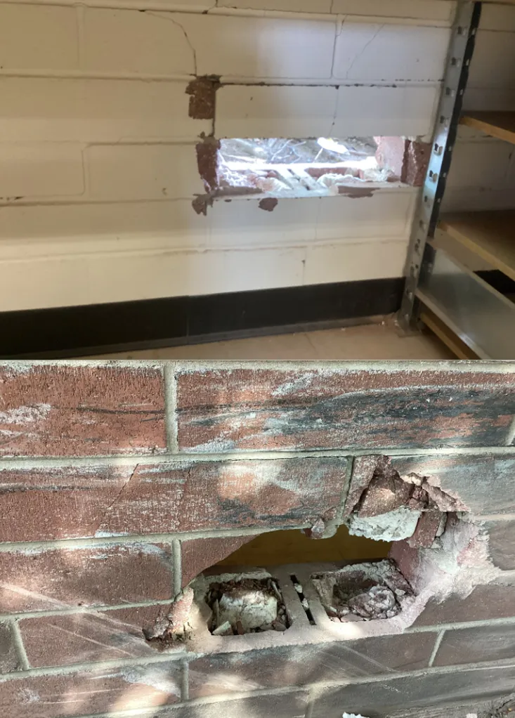 Majestic provided emergency 2-hour onsite service to provide a watertight board up to ensure safety and security of the building. Returned to site with materials and proceeded to install new block and mortar, tuck point wall where lose mortar has fallen out around damaged area and painted the block wall on the inside. Cleaned up job site and hauled away debris upon completion.