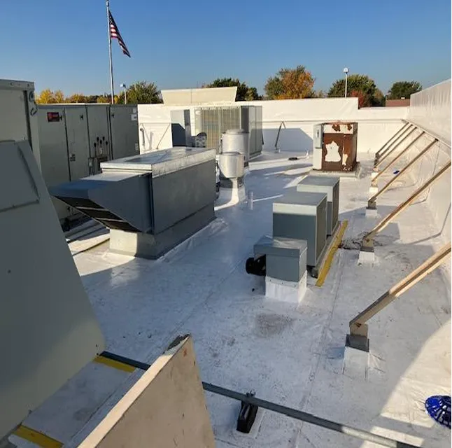 Provided labor and materials for Duro-Last 50mil white roofing system overlayed over existing system. Will mechanically fasten new membrane and dispose of all job-related debris offsite. Remove existing sheet metal perimeter parapet coping and dispose of in a state approved landfill. Run new Duro-Last parapet wall flashings up and over existing parapet. Flash in parapet support brackets on the back side of the existing parapets. Provide and install new Duro-Last 2-Piece Compression metal to be 24-gauge prefinished steel.